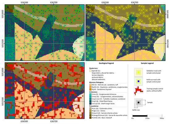 Sampling was performed on the digitized geological map, but since the processing was pixel-based, the vector format was re-rasterized. In the case of lithological maps, the pixel size was chosen to match the Sentinel-2 datasets (10 m spatial resolution). The lithological units are represented by a different number of pixels for each lithological type. There are dominant classes with great coverage, such as class 1 (218,576 pixels), which includes slope debris, alluvial fan debris, and different terrace deposits. This is followed by Cretaceous units, such as class 6 (129,925 pixels) and class 5 (119,728 pixels). This indicates the dominance of sedimentary rocks. The least dominant features in the examined area are class 8, (distal flysch facies) and class 14 (basic metatuff), with only 320 and 455 pixels, respectively. There are other classes showing moderate representations, with pixel counts ranging from 4400 (class 4) to 78,561 (class 12).