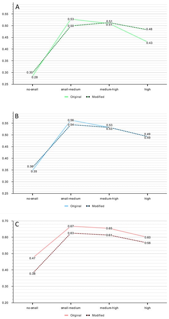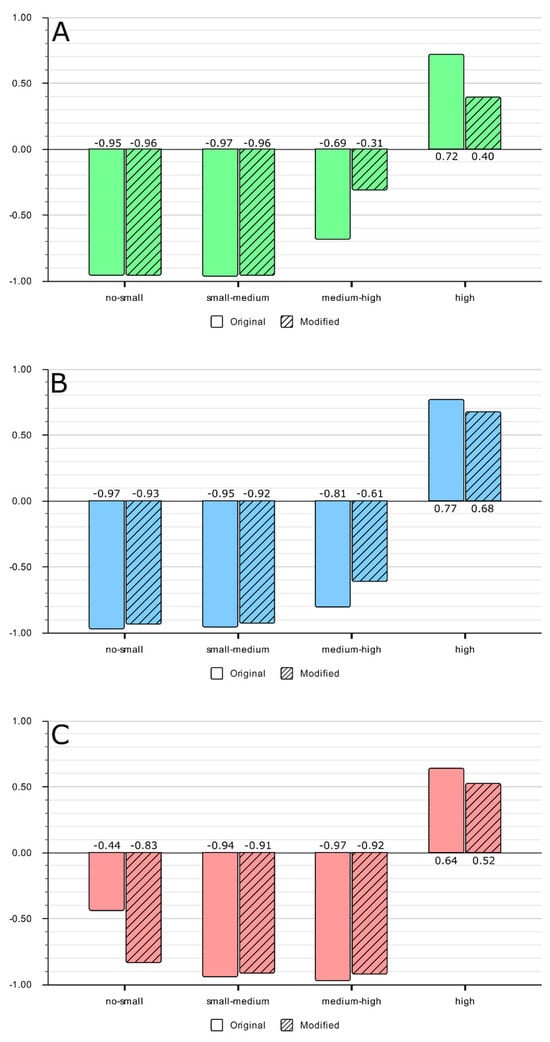 The comparison between band-wise contributions to the PCA output revealed notable shifts between the original and the decorrelated datasets (Table 4). In both cases, bands B8, B12, and B7 were the most informative. In the modified dataset, the value of band B8 increased from 0.179 to 0.221; the values of bands B12 and B7 also increased. The additional values of the other bands were less significant, though the order changed between the two datasets. Every other band lost significance when the dataset was modified, except B3, B2, and B1. This suggests that decorrelation suppresses some redundant spectral information while enhancing the relevance of others, with the order remaining almost the same. The low contribution of SRTM in both cases is expected, though it is also present in the results.