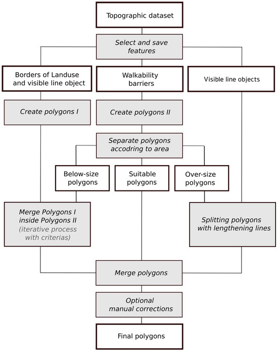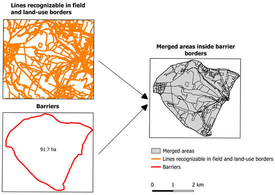 Barrier lines were polygonized in a process similar to step 2. Since some barriers do not form closed loops (e.g., a rivulet ending in a spring), only basic area segments could be created.