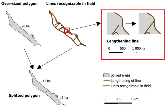 Lines located within excessively large polygons were detected and extended, including those that did not originally reach the polygon boundaries. All the lines were considered. These extended lines were then assessed to determine whether they could effectively subdivide the polygon without creating excessively small parts. If the subdivision was appropriate, the polygon was split.