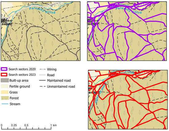 Figure 7 illustrates the creation of search sectors in a selected area. In the upper left corner, line objects recognizable in the field were used to delineate sector boundaries. In this case, the boundary follows both a power line and the edge between a grass-covered area and arable land. Within the larger forested area, roads were primarily used to define the search sectors. A greater number of polygons were generated in 2023, as the shortcomings in line representation of certain roads were automatically resolved.