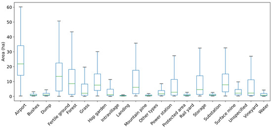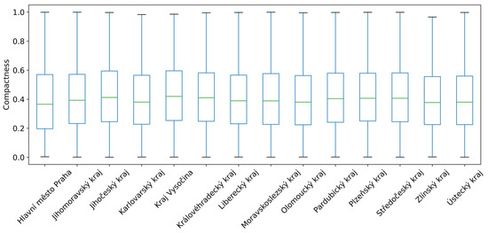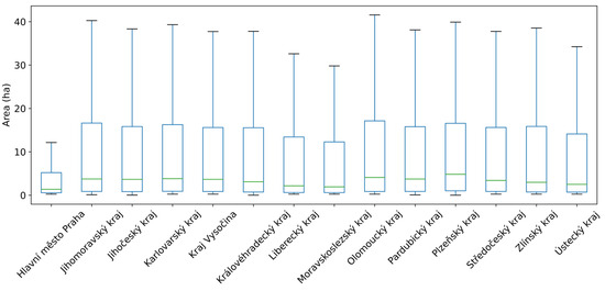 Figure 8) shows that most polygons were larger than the median area for their respective regions. The smallest polygons were created in the Prague region, reflecting its highest heterogeneity (