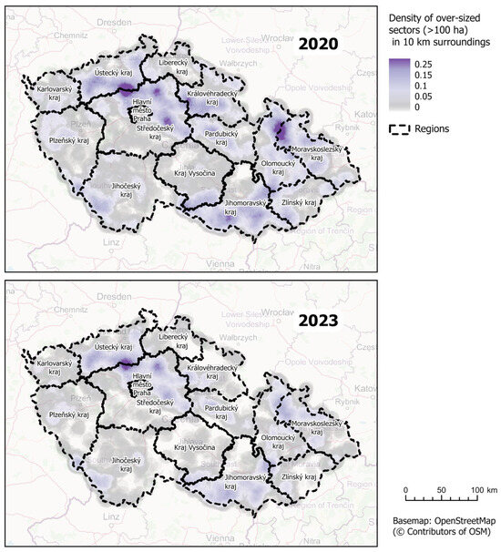 When comparing the two stages of polygon creation (2020 and 2023), it can be observed that the concentration of excessively large sectors in 2023 decreased along the border of the Moravskoslezský and Olomoucký regions.