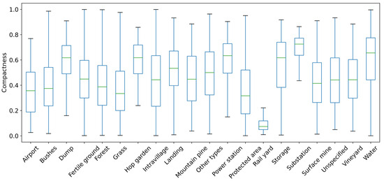 Figure 12). Rail yards exhibited very low compactness due to their inherently elongated shape. Other artificially created surfaces, such as power stations, substations, dumps, and intravillage areas, showed higher compactness. By contrast, naturally occurring areas such as protected sites, grasslands, and bushes generally had lower compactness, with the notable exception of water bodies.