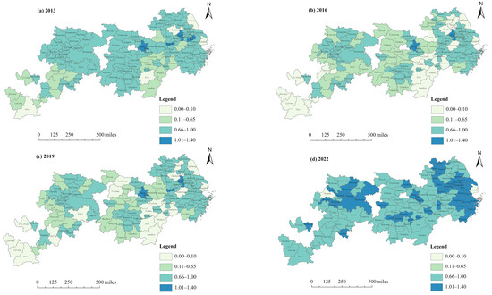 Spatial distribution maps of land-use spatial equilibrium degrees in 2013, 2016, 2019, and 2022. Note: Due to unmeasured land-use spatial equilibrium in cities experiencing imbalances (overdevelopment and underdevelopment), a uniform value of 0.1 is assigned, displayed as (0, 0.10] in the subfigures.