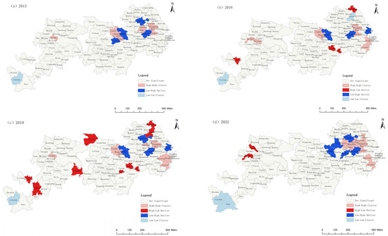 To further explore the spatial clustering characteristics among prefecture-level cities, local spatial autocorrelation analysis of land-use spatial equilibrium degrees in 2013, 2016, 2019, and 2022 was conducted, and the results are shown in Figure 7. In the local spatial autocorrelation analysis (LISA), the number of permutations was set to 499, and the False Discovery Rate (FDR) method was applied for multiple testing control to reduce the risk of false significance.