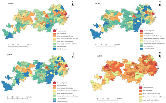 Finally, based on the quantitative classification results of the land-use spatial balance index and efficiency index from 2013, 2016, 2019, and 2020, combined with the analysis results of the land-use spatial equilibrium degrees in the YREB, eight types are identified, including overdevelopment, underdevelopment, high equilibrium, medium equilibrium (differentiated into strong-demand, high-efficiency; strong-demand, medium–low-efficiency; strong-supply, high-efficiency; and strong-supply, medium–low-efficiency), and low equilibrium, as shown in Table 3.