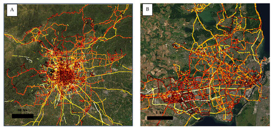 Analyzing mobility patterns using high-resolution travel data supports planning in areas such as mode choice and demand forecasting [7], behavioral modeling [8,9], and emission mitigation [10]. Historically, such analysis relied on travel surveys using diaries, interviews, or forms [11,12], which were prone to self-reporting biases and incomplete data. Efforts to automate these processes emerged in studies using GNSS devices linked to handheld computers [13]. However, these early datasets were limited in participant diversity. Technological advances over the past two decades—such as miniaturized GNSS, Bluetooth, GSM, and Wi-Fi-based tracking—have significantly improved the quality and scale of trajectory data [14,15,16]. Smartphones and wearables now enable large-scale, heterogeneous data collection.