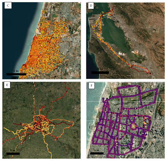 Figure 1. Schematic locator maps providing geographic context for the GeoLife (A), Bernitt (B), Bird (C), MobilityNet (D), Sultan (Osnabrück data only, (E)), and PedFlow (F) travel datasets. Brighter colors indicate higher speeds. Background: Google Maps. Scale bars are 5 km, except (A,D), which use 20 km, and (F), which uses 1 km.