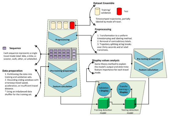 Our study employed an ensemble of labeled trajectory datasets, several of which included e-scooters and e-bikes, from diverse urban environments including Germany, Tel Aviv, Copenhagen, China, and San Francisco, capturing a wide range of infrastructures and travel cultures. Most datasets were previously validated in urban mobility studies [42,43,44,45,46]. The Geolife dataset [42] contains multimodal trajectories from Beijing, excluding electric micro-mobility modes. In contrast, the Bernitt dataset [43] from Copenhagen includes only e-bike trips. The Bird dataset from Tel Aviv consists exclusively of e-scooter trajectories. The Sultan dataset [45] from Germany and The Netherlands comprises bicycle trajectories sourced from AllTrails.com, while the PedFlow dataset [46] contains pedestrian trajectories only from Tel Aviv collected for pedestrian flow modeling. Travel-mode overlap between datasets was limited; only the MobilityNet dataset [44] from San Fransico contained all relevant travel modes and was thus selected for cross-domain (transfer learning) evaluation. For consistency, all motorized vehicles were grouped into a single category (“other”), allowing the model to focus on differentiating active travel modes.