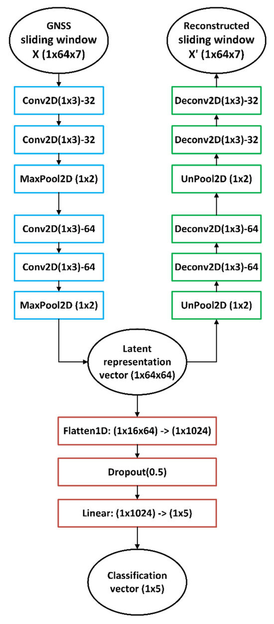 Figure 3. Implemented architecture: blue—encoder; green—decoder; red—classifier. Ovals—input and output vectors.