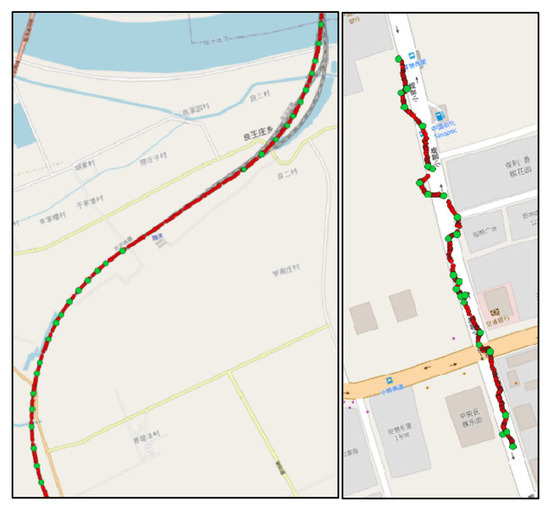 Figure 4. RDP implementation: train (left) and e-bike (right). Output RDP points (green) that are a subset of the original sequence of trajectory waypoints (red). Background: OpenStreetMap contributors, Beijing area.