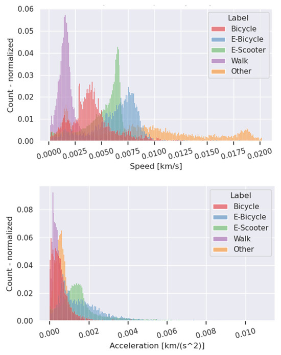 Statistical metrics of spatiotemporal features could provide a basic understanding as to which travel properties show correlations with a specific travel mode. The speed feature, for example, represents a somewhat good correlation in most metrics, as the histograms calculated per travel mode show peaks of higher probability relating to a specific mode, as depicted in Figure 5 (top). Other features, such as relative distance and RDP, show similar results (see Appendix A for analysis of all features). On the other hand, ambiguities are observed for the acceleration and jerk features. In terms of distribution of the acceleration metric, e-scooters and e-bikes seemingly differ from other modes, as depicted in Figure 5 (bottom). The different acceleration magnitude behaviors for the electric micro-mobility modes may stem from the fact that both quickly reach high acceleration values over short distances [53].