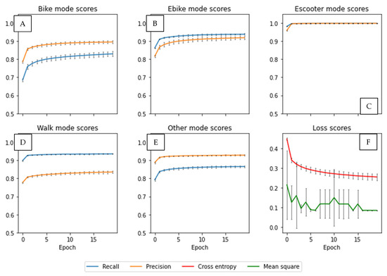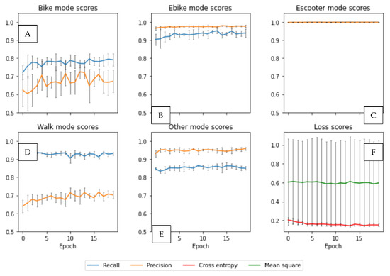 Given a confusion matrix of classification results per sequence, true positive (tp), false positive (fp), true negative (tn) and false negative (fn) prediction counts are extracted per label (travel mode). Score metrics, depicted in Equations (8)–(10), are calculated discretely for each label, to account for possible imbalances.