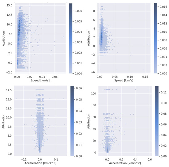 The detection model is positively affected by the speed features of bikes and e-bikes, as depicted in Figure 9 (top) in the main article. Unlike walk and e-scooter heatmaps, depicted in Figure A9, this mainly shows negative attributions for all speed values, meaning that speed hinders the NN’s ability to detect these travel modes. This is unlike the descriptive analysis, where a clear speed distribution difference between walk and rest was seen; as such, it could be assumed that the speed feature could contribute to the walk classification accuracy.