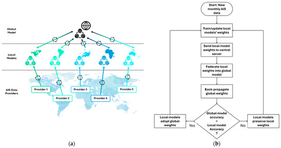 The proposed solution implements a lifelong learning cycle. Figure 1a shows five hypothetical AIS data providers, each continuously supplying AIS data from different regions. In the first cycle, each provider uses recent data (e.g., from the previous month) to calculate vessel traffic densities and train local prediction models. Figure 1b describes the lifelong learning cycle’s steps in a flowchart. Local model weights are sent to a central server and federated into a global model.