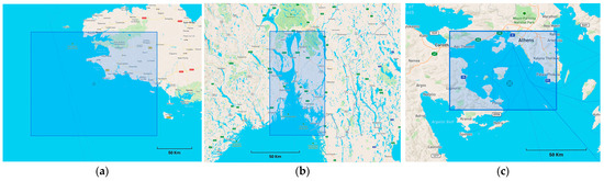 Since public real-time AIS datasets are not easy to find, the selected approach is based on historical data, which were divided into monthly batches. Three datasets were selected: the Brest dataset (Brest coast and port area, France, Atlantic Ocean—Figure 2a) [29], the Kystverket dataset (Oslo Fjord area, Norway, Baltic Sea—Figure 2b) [30] and the Piraeus dataset (Athens coast and port area, Greece, Mediterranean Sea—Figure 2c) [31].