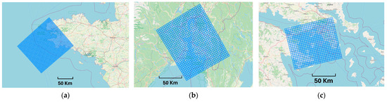 PostGIS functions were used to define four-by-four-kilometre grid cells covering the AoIs presented in Figure 2 and to transform distance-based coordinates back to WGS84. Grid cell data was stored in a new database table, the Grid table, which includes a cell identifier (“CellID”), minimum and maximum latitudes and longitudes, and a geometry object (“Shape”) representing the cell’s spatial polygon. Figure 3 depicts the resulting grids: (a) Brest, (b) Kystverket, and (c) Piraeus.