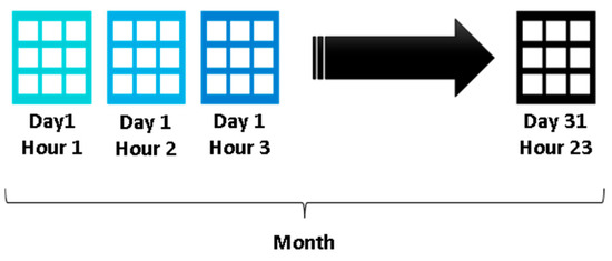 The resulting Density table represents a monthly aggregation of hourly density matrices, aligned with the temporal span and granularity defined during grid definition. Each matrix’s dimensions match the number of horizontal and vertical cells in the AoI grid. Figure 4 illustrates this structure. For a 31-day month like March, there are 744 matrices. Matrix size varies by dataset (e.g., Brest has a 43 × 37 grid, Piraeus 27 × 23, and Kystverket 29 × 34).