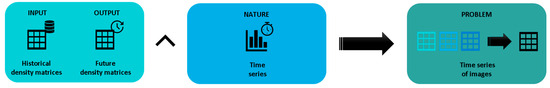 In this context, the task resembles an image processing-based next-frame prediction problem, developing a model that transforms sparse input density matrices into future states of the same shape, as a matrix-to-matrix transformation. This model aims to predict the future state of the density grid while maintaining the same matrix shape. Each cell’s density depends on its previous state, giving the data a time-series of images nature (Figure 5). Leveraging convolutional layers for spatial feature extraction and temporal pattern learning is a promising approach.