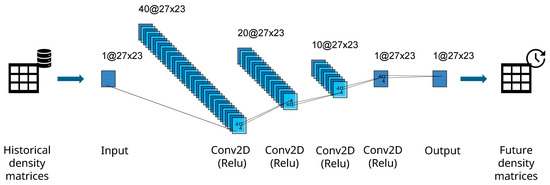 This approach was selected after a thorough evaluation of methods suited to the problem’s characteristics defined in Figure 5, such as fixed matrix size and sparsity. The architecture, number of convolutional layers, kernels per layer, and other hyperparameters were determined through extensive experimentation with different CNN configurations. Hence, the authors deployed the architecture presented in Figure 6, with four Conv2D convolutional layers’ shapes, comprising the number of horizontal cells and the number of vertical cells of the density matrices generated for the Brest dataset, along with each layer’s number of filters (respectively, 40, 20, 10 and 1). All convolutional layers use a 4 × 4 kernel and ReLu as the activation function, with the same padding across layers to keep the original spatial structure of the input matrices.