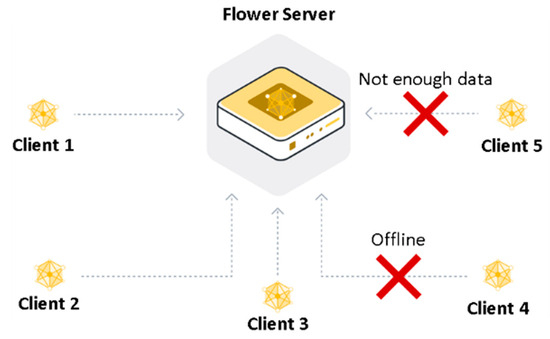 Several FL libraries were reviewed and tested to identify the best fit for the proposed solution [37]. Flower [38], an open-source FL framework, proved most suitable due to its flexible, modular architecture that supports integration with major ML frameworks like TensorFlow and PyTorch. Its ability to handle slow or delayed clients and reduce model update sizes is particularly advantageous. Additional strengths include cross-platform compatibility, adaptability to various devices, and scalability to millions of clients. Figure 7 depicts the Flower-based FL client-server structure. During scheduled communication, not all clients may be available, due to being offline or lacking data or resources; thus, the global model is updated using only the weights from available clients.