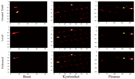 The top row shows the ground truth for the sample hour, while the middle and bottom rows display the VTD predictions from the local and global models, respectively. The outputs align with the results in Table 7: (i) predictions for the Brest AoI are generally less accurate, though the federated model outperforms the local one; (ii) for both Kystverket and Piraeus, local and global models provide strong predictions, with the global model performing slightly better. As part of the European Commission-funded VesselAI project, a visualization dashboard was developed using Apache Superset [43] to analyse and evaluate both models’ results against ground truth data for specific periods (e.g., day, hour).