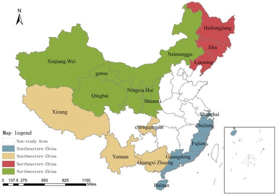 Eighteen provinces explicitly designated within the scope of the Vision and Actions on Jointly Building Silk Road Economic Belt and 21st-Century Maritime Silk Road (hereinafter referred to as Vision and Actions) were selected as the research subjects. These provinces were categorized into four regions according to geographical location: Northwest, Southwest, Northeast, and Southeast China (Figure 1). As strategic pivots in China’s supply chain, the stability of logistics systems directly influences the operational efficiency and risk resilience of the New Land–Sea Corridor. Furthermore, significant disparities exist between the eastern and western parts of this region concerning node network distribution and logistics system development levels. Investigating the spatial differentiation patterns of their resilience-driving mechanisms can provide a scientific basis for differentially enhancing the shock-resistance capacity of key logistics nodes and, consequently, improving the overall stability of the logistics system.