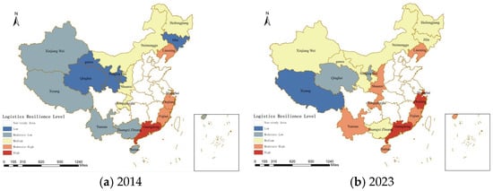Overall, the logistical resilience of provinces along the B&R generally exhibited an increasing trend between 2014 and 2023; this indicates a gradual increase in the resistance and recovery capacities of logistics systems when confronting impacts from various uncertainties over time. With respect to interregional distributions, significant disparities in logistical resilience levels exist across different regions. The comprehensive resilience scores display a distinct gradient, decreasing progressively from the southeastern coastal areas toward the northwestern inland regions. By utilizing the specific resilience scores in the table and applying the natural breaks classification method [45], the regions were categorized into five types: low-resilience region [0, 0.085], medium-low-resilience region (0.085, 0.120], medium-resilience region (0.120, 0.187], medium-high-resilience region (0.187, 0.326], and high-resilience region (0.326, 0.644].