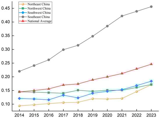 From that image we can see the changes in logistical resilience levels across different regions from 2014 to 2023 (Figure 3). It is evident that regions with higher logistical resilience are predominantly concentrated in southeastern coastal areas, where resilience levels significantly surpass those of inland regions. In particular, certain provinces, such as Guangdong and Shanghai, consistently exhibited leading logistical resilience in most years. Furthermore, the southeastern region as a whole recorded an average annual growth rate (12.02%) during the study period that far exceeded the overall average (7.66%). This disparity is foreseeable. Coastal regions inherently possess unique geographical advantages, consistently fostering more advanced logistics development than inland areas do. They typically boast natural deep-water ports, such as Shanghai Port and Ningbo-Zhoushan Port. These ports serve as critical intersections for domestic and international logistics, providing efficient transshipment platforms for goods. Simultaneously, by acting as cargo concentration hubs, they attract freight from diverse origins, generating a cargo agglomeration effect. Second, coastal regions benefit from diversified industrial structures, vast consumer markets, and substantial logistics demand. Coupled with well-developed transportation infrastructure and preferential national policies, these factors collectively promote the prosperity of the coastal logistics industry and increase its resilience.