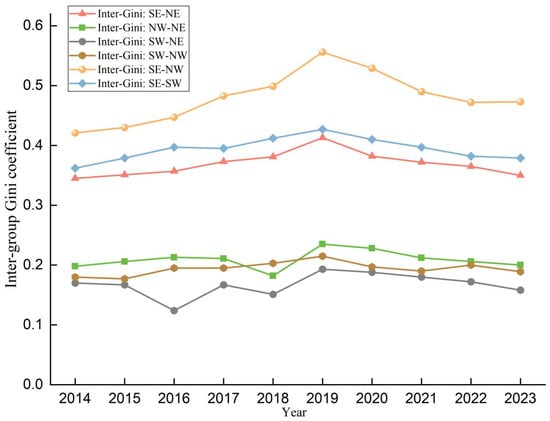 Derived from parts of the table above, provides a more intuitive visualization of the interregional disparities (Figure 4). Although the intergroup Gini coefficients for various regional pairs exhibited some localized fluctuations, they generally showed a slow declining trend in recent years. With respect to interregional differences, the southeastern region emerged as the primary contributor to the overall disparity. The regional pairs exhibiting relatively high intergroup Gini coefficients were Southeast–Southwest and Southeast–Northwest, which is also understandable. The southeastern region, which is located along the coast and has numerous ports, possesses inherent advantages such as convenient transportation networks and well-positioned logistics hubs. This provides a solid foundation for foreign trade and cross-border e-commerce, resulting in a significantly higher level of logistics industry development than in other regions. Consequently, the logistical resilience level in Southeast China also differs substantially from that of the western regions. Therefore, the relatively high intergroup Gini coefficients between the southeastern region and other regions constitute the main source of logistical resilience disparity. However, with the advancement of the BRI and the orderly promotion of coordinated regional development, coupled with logistics industry development in coastal areas approaching saturation, logistical resilience levels across various regions have shown a convergence trend since 2020; this signifies a gradual narrowing of the logistical resilience gap between different regions.