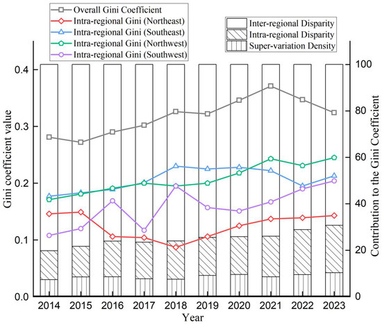 Consequently, the overall Dagum Gini coefficient displayed a gradual upward trend during the study period, increasing from 0.281 in 2014 to 0.354 in 2023—a rise of approximately 25.98% over the decade. The specific reasons for this are explored in the following analysis of the contributions from interregional, intraregional, and transvariation density components.