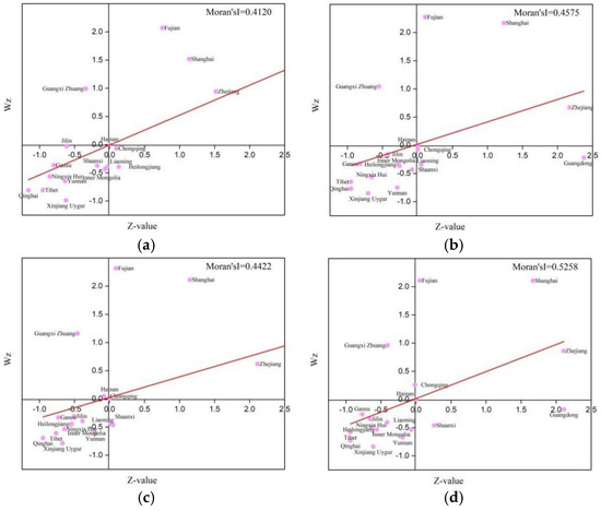 Scatter map of Moran’s I for logistics resilience along the B&R. Note: (a–d) present the Moran scatter plot data for 2016, 2018, 2020, and 2022, respectively. Regional names are denoted with abbreviations in the figures.