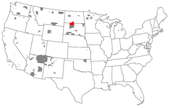 Map of American Indian reservations in the contiguous United States. The Standing Rock Sioux reservation is highlighted in red. Data source: U.S. Census Bureau, Federal American Indian Reservations (AIR). Used with permission [].