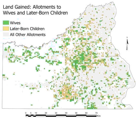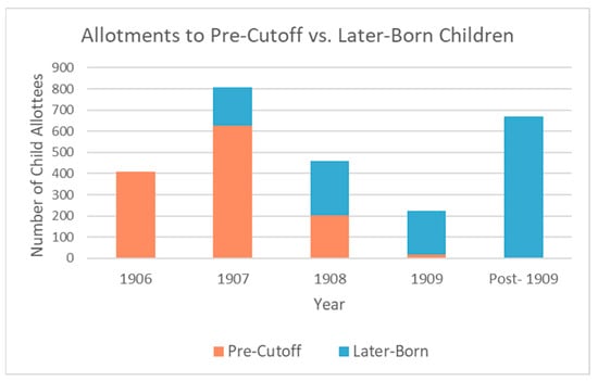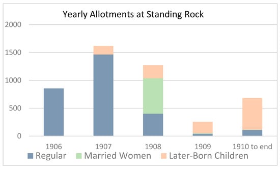 One of the most noteworthy aspects of allotment at Standing Rock, and a major focus of this paper, is that the inhabitants of the reservation were able to successfully petition the government for allotments to the two groups initially excluded: married women and “later-born children”, i.e., children born after 26 September 1905, the date of the authorizing letter. These modifications, including a provision to equitably allot timber, were approved by an Act of Congress in 1907 [], when the allotment process was already well underway.