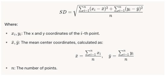 - ESRI. ArcGIS Pro. Standard Distance. Available online: https://pro.arcgis.com/en/pro-app/latest/tool-reference/spatial-statistics/standard-distance.htm (accessed on 23 August 2025).