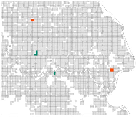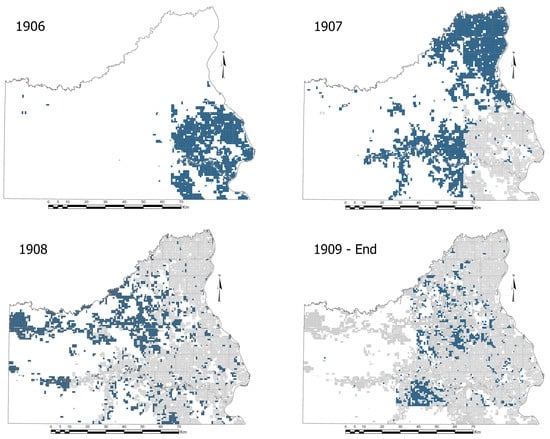 All told, records available to us showed that allotments were made to 4699 individuals at Standing Rock, consisting of 10,996 separate parcels totaling 1,342,751 acres (543,392 ha). The broad spatio-temporal pattern of allotment making by Gunderson and his crew can be seen in Figure 4. As noted earlier, he proceeded in an orderly pattern, beginning in the southeast corner of the reservation in 1906. In 1907, he continued moving westward in the South Dakota part of the reservation, moving to a certain point along the Grand River until he and his crew shifted to the northeast region of the reservation in North Dakota. He and his crew continued moving westward in the northern and then the southern reaches of Standing Rock in 1908 until they reached the western boundary of the reservation. There was also some infilling of allotments in the east in 1908, where the land had earlier been surveyed and allotments made. A significant change in patterns can be seen in 1909 and later, where allotments entirely consisted of infilling of the previously allotted eastern part of the reservation; almost no allotments at all were made in the vast empty areas in the west and in a swath along the south during that final period. The cause of this was the creation of a “Diminished Reserve” in the eastern part of the reservation on 1 January 1909, discussed further, below.