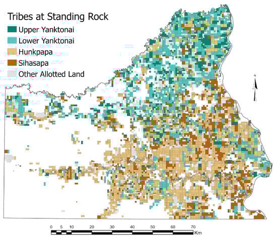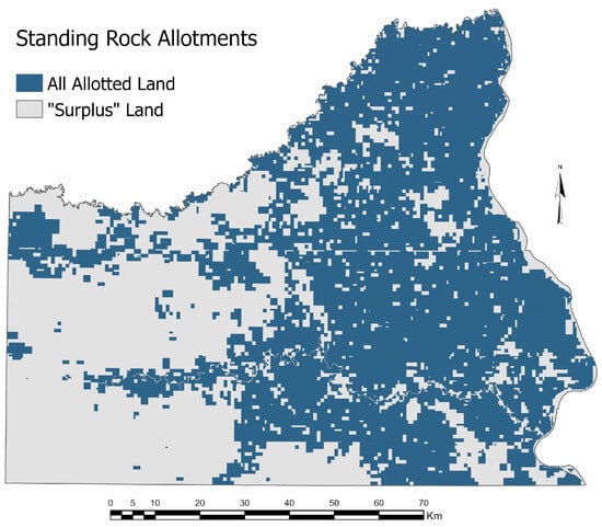 The data and methods used to develop the underlying spatial database of allotments are fully described in []. We summarize them briefly here but recommend that the interested reader consult that article for full details. In short, two primary types of data sources were combined in a novel method to create a cadastral database of allotments: (1) a digital GIS database of the U.S. Public Land Survey System (PLSS) for the Standing Rock Reservation and (2) archival (pen and paper) and digital records of land allotments made to individuals at Standing Rock. We developed a semi-automated method to refine and subdivide the digital PLSS survey database to include as many of the allotment parcels as possible, including the smallest parcels and those of irregular sizes. For the attribute database, the archival register of allotments kept by Carl Gunderson at Standing Rock [] was transcribed and combined with the digital land ownership database of the U.S. Bureau of Land Management [], each having its unique qualities. The allotment number of each allottee and the legal description of each land parcel were used to join the survey and attribute databases. Finally, the tribal affiliation of each allottee was added to the attribute data by referring to censuses conducted at Standing Rock [] in the 1880s and early 1890s, using an individual’s name, age, gender, and any other identifying information from the allotment register as lookup references.