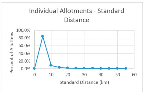 In addition to graphs of distance and standard distance metrics, we created numerous maps to serve as visualization tools. The maps provided visual confirmation of the statistical results. All GIS processing for this study was conducted using ArcGIS Pro 3.4.0. (the earlier development of our semi-automated allotment mapping methodology used ArcGIS Desktop 10.4). We used the USA Contiguous Albers Equal Area Conic map projection (WKID 102003) based on the North American Datum of 1983. To facilitate tabular analysis, we exported tables from ArGIS Pro to Microsoft Excel for calculating distance and descriptive statistics.