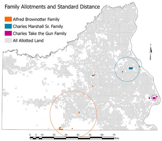 Allotment—the division of Native American reservations into individually-owned plots of land—has been extensively studied; yet there exists a paucity of reservation-level studies at granular geospatial scales, i.e., at the level of examining the impacts of allotment on individuals, families, and clan or tribal groups. In previous research, we described a new semi-automated method for creating detailed GIS allotment databases and discussed the policies and processes that that lay behind allotment at the Standing Rock Reservation. In this study, we employed our Standing Rock database to map and explore allotment patterns in detail. We primarily focused on patterns of clustering versus dispersion of allotment parcels for individuals, families, and tribal groups by calculating median distance (and other descriptive statistics) and standard distance in GIS. Throughout, we used mapped representations of allotment patterns as visualization tools, both for confirming hypotheses and raising new questions. As anticipated, we discovered patterns of both gain and loss. On the one hand, as we had found earlier, the people at Standing Rock gained land through their insistence on allotments for married women and for children born after the beginning date of allotment (“later-born children”), land they otherwise would not have received. We also confirmed that married women only received half the land that their husbands received and that the early sale of “surplus” reservation lands deprived a future generation of children of the opportunity to receive their own land. Perhaps most importantly, however, we discovered that the belated timing of allotments to married women and later-born children caused their allotments to be located at some distance from those of their husbands or fathers, creating disjunct and dispersed patterns of family land holdings that would have significantly hampered the creation of viable farming and ranching operations.