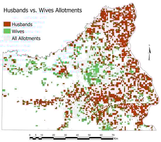Of note for this study, the following provisions of the letter are most relevant. The allotting agent, as far as possible, was to honor the land selections of the allottees, especially where structures and other improvements had been built on land where they already resided. Males and females were to receive equal quantities of land, except that married women were not entitled to allotments at all, on the theory that they would enjoy the benefits of the land allotted to their husbands, even though they had no legal ownership interest, reflecting the view of women’s rights in that era [,]. Furthermore, allotments were not to be made to children born after the date of the President’s authorizing letter: 26 September 1905.