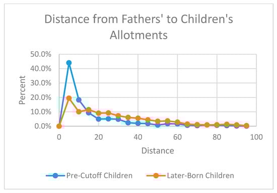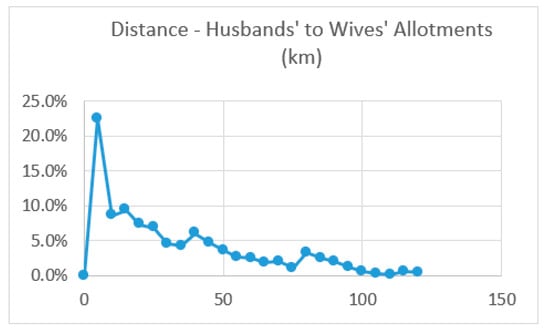 To prepare our data for analysis, we calculated centroids for several categories of allotment recipients. We began by calculating the centroid of each allotment parcel comprising a person’s allotment. We then calculated the overall centroid of each person’s allotment (a centroid of centroids). Once that was complete, we used matching relationship numbers in our allotment database to calculate distances between the centroids of allotments of various categories of interest, i.e., husbands to wives, fathers to pre-cutoff children, and fathers to later-born children. We calculated descriptive statistics (mean, median, standard deviation, interquartile range, and others) of the distances between allotment centroids. Next, we created frequency distribution charts of distances between the categories of allotment recipients (e.g., husbands to wives) to complement maps of the same categories.
