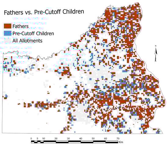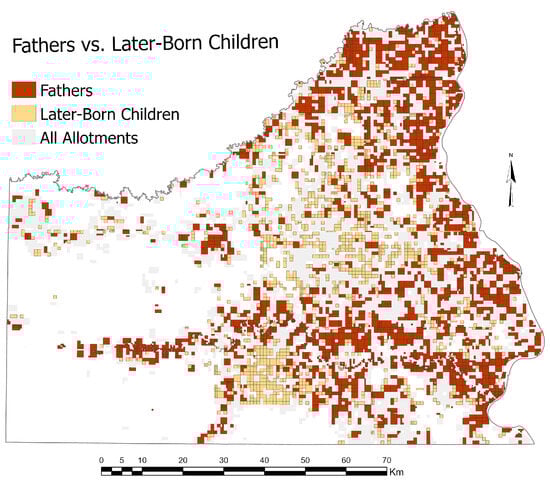 However, as we had described in an earlier paper [], the people at Standing Rock had successfully petitioned for allotments to two groups that were initially ineligible: married women and later-born children. As noted above, the timing of this decision disrupted Gunderson’s orderly process of making land allotments, meaning that most of those in these two groups were allotted later than their husband and fathers, ranging in time from a few months to a year or more. The potential implication of these belated, non-simultaneous allotments to married women and later-born children was that they were less likely to be adjacent to the fathers’ allotments. Gunderson himself noted that some women and children were compelled to take allotments at some distance from their husband or father [] (p. 425). We therefore sought to map and quantify this claim.