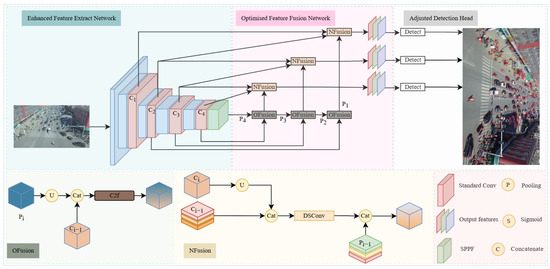 In the process of urban modernization, the wide application of high technology has penetrated every aspect of our lives. The swift advancement of UAV technology, one of the representatives of high technology, has brought about revolutionary changes in several fields. UAVs not only provide an efficient means of information collection in the fields of military defense [1], agricultural production [2], traffic monitoring [3], and hazardous condition monitoring [4], but their advanced intelligent processing capabilities are also crucial for solving complex problems in ground observation. In traffic monitoring, UAVs can monitor traffic flow in real-time through object detection technology to prevent traffic congestion [5,6]. In hazardous condition monitoring, UAVs can quickly locate trapped people and provide timely and critical information for rescue teams [7]. These applications demonstrate the importance of the UAV as an aerial observation platform and have been widely used in multiple fields. However, the broader and more varied observation angles of UAVs result in captured images that have characteristics such as small targets, complex backgrounds, and large-scale changes. These characteristics differ significantly from images captured by conventional cameras, posing more significant challenges to detection technology. Especially in object detection, the dense arrangement of small targets, more complex environments, and unclear target boundaries make it difficult for traditional object detection algorithms to ensure rapid and accurate detection in UAV-related tasks. These difficulties limit the application of UAV technology and bring new challenges to the research in computer vision.