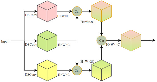 In the MKConv module, we use depth-separable convolutions with various kernel sizes to extend the receptive field and extract target features at varying spatial resolutions from . The distinction among these feature maps is that they focus on targets at various scales and contain rich semantic information. The calculation process is illustrated in Equations (1)–(3).