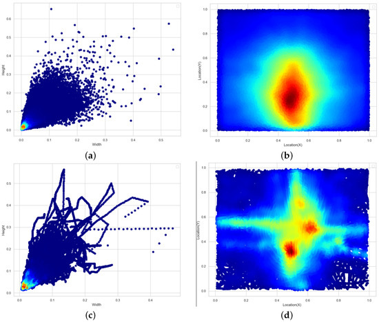 (2) UAVDT: This large-scale benchmark dataset, captured by UAVs in complex environments, features diverse scenarios and high complexity. It is manually annotated and poses significant challenges for UAV detection and tracking. The image resolution is uniformly 1080 × 540, and the target categories in the images are mainly focused on vehicles, including car, bus, and truck [44]. Compared with the VisDrone dataset, the dataset is well-suited for vehicle detection in road images, featuring diverse weather conditions, angles, and scenes. The dataset covers various scenarios and conditions, providing researchers with a rich data resource that facilitates the development and evaluation of UAV vision technologies. Figure 5 presents the statistical distributions of the UAVDT dataset, with Figure 5c,d illustrating the target-size distribution and spatial-position distribution, respectively. The analysis reveals that (1) most targets have width/height dimensions smaller than 10% of the image size; and (2) targets show significant spatial aggregation, with the highest density observed in central image regions. As shown in Table 2, cars comprise the majority of samples in the UAVDT dataset. This predominance reflects the dataset’s focus on urban road scenes, where cars naturally appear more frequently than other objects. We maintain this natural sample distribution to preserve the dataset’s realistic representation of traffic environments, making it a valuable benchmark for drone-based detection research.