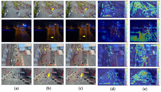 Example of comparison between visualization results and heatmap. (a) Original image. (b) Visualization results of baseline model. (c) Visualization results of BFRDNet. (d) Heatmap results of baseline model. (e) Heatmap results of BFRDNet. The heatmap’s color scale (right) indicates model attention intensity, ranging from 0 (blue, low attention) to 1 (red, high attention).