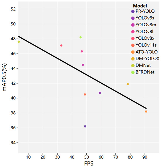 In real application scenarios, how to measure the value between accuracy and speed is an issue that cannot be ignored. As shown in Figure 7, we have plotted a scatter plot of model accuracy and inference speed. The black regression line indicates that FPS increases as accuracy decreases. Although BFRDNet does not have the highest inference speed, its FPS already meets the requirements of real-time detection (FPS > 30), demonstrating greater advantages in accuracy. This observation is further supported by the comprehensive metric comparison in Table 6. DMNet approaches BFRDNet’s accuracy (47.6%) but suffers impractical latency (3.45 FPS). While achieving superior frame rates, both ATO-YOLO and DM-YOLOX exhibit substantially compromised detection performance compared to BFRDNet at comparable model complexities. These results collectively validate BFRDNet’s unprecedented balance between computational efficiency and detection performance.