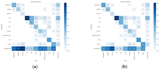 Figure 8 vividly illustrates the comparative analysis of prediction results for each category between the baseline model and BFRDNet. A marked enhancement in the values along the main diagonal is evident when juxtaposed with the baseline model, indicating a significant advancement in BFRDNet’s ability to accurately predict multi-scale targets. Furthermore, by examining the data in the last row of the confusion matrix, it is clear that BFRDNet exhibits lower matrix values. This reduction indicates that BFRDNet significantly diminishes the error rate associated with misclassifying objects as background. These observations underscore the efficacy of BFRDNet’s feature extraction capabilities, enabling it to discern targets from complex backgrounds more adeptly.