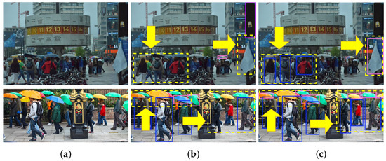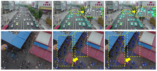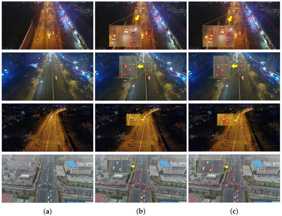 Visualization comparison results for the VisDrone dataset (first and second rows) and UAVDT dataset (third and fourth rows). Columns (a–c) represent the original image, the baseline model detection results, and the BFRDNetV2 model detection results, respectively.